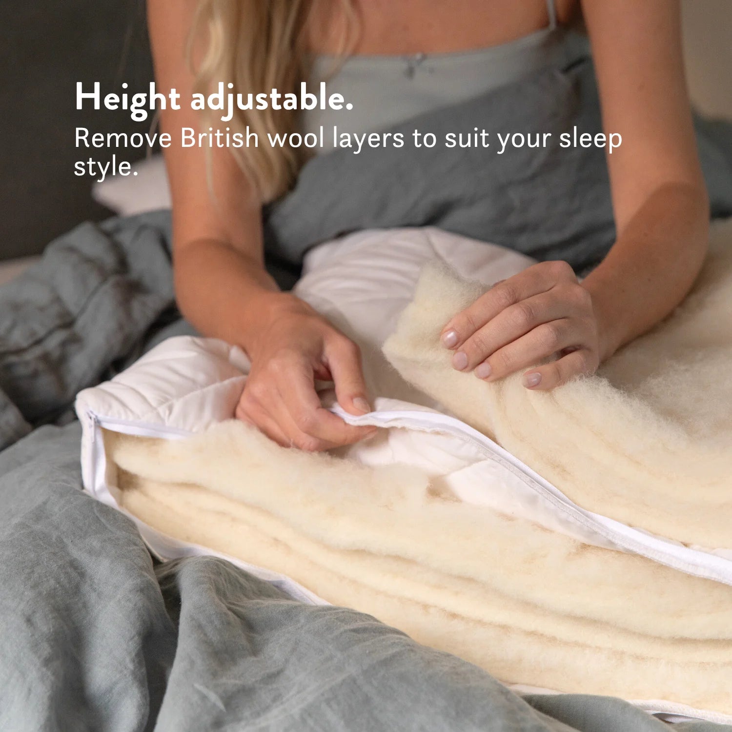 Height-adjustable wool pillow with traceable British wool and a 100% cotton OEKO-TEX cover. Naturally hypoallergenic, breathable, and ideal for side and back sleepers.